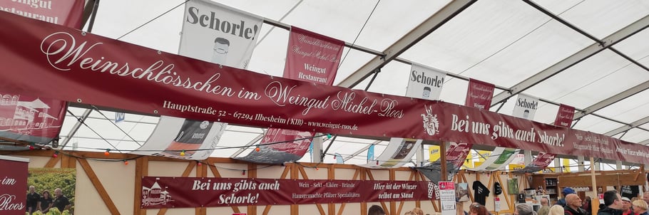 Top Ausgestattet mit einer brandneuen Messestandbeflaggung und einladenden Bannern und Rollups aus dem Hause Fahrwerk konnte das Weinschlösschen im Weingut Michel-Roos auf dem diesjährigen Maimarkt wieder Gläser füllen und trockene Kehlen fröhlich machen.